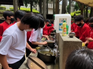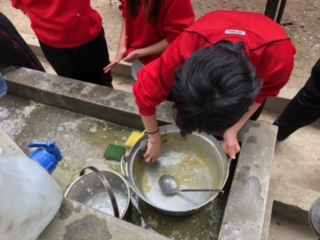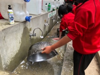 鍋の底にこべりついた米やルーに苦戦しながらも掃除をしています。