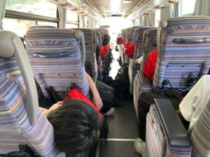 バスは宇陀市に入りました。 疲れてゆっくり寝る生徒も多いです。