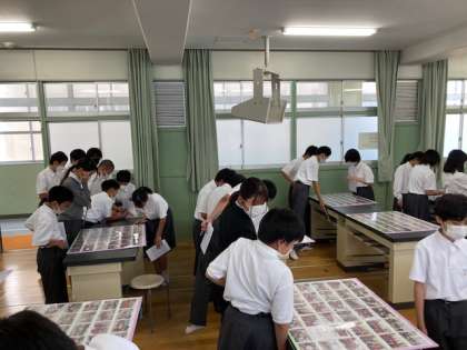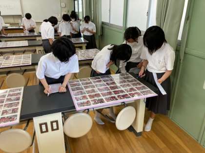 1年生は5月10、11日の一泊移住で撮影してもらった写真の見本を、クラスごとに見てまわりました。