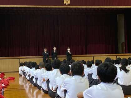 1年生の学年集会では、今週月曜日より皆さんと一緒に勉強している教育実習の先生の挨拶から始まりました。