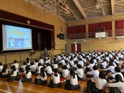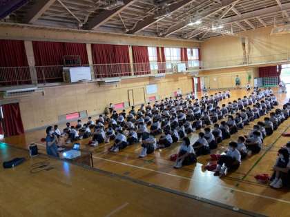 今日は最初の授業なので、体育館にて1年生全体で沖縄の文化や地理的な見方を勉強しました。