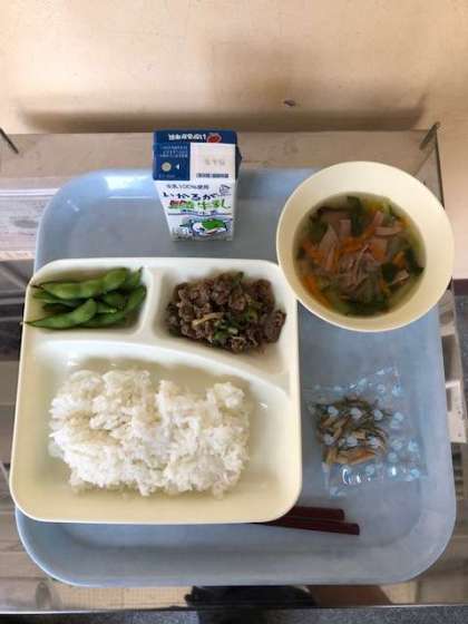 ごはん、牛乳 チンジャオロースー ハムと野菜の中華スープ えだまめ アーモンドフィッシュ