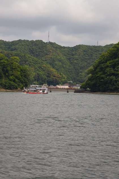 高知の民謡を聞きながら、赤い橋の近くを通ります 船が通ると、ボラという魚が跳ねていきます