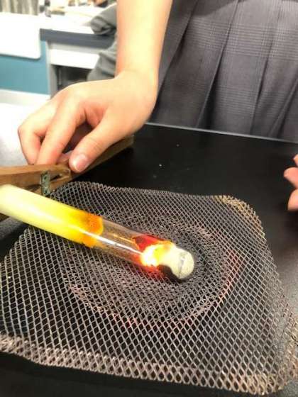 蒸気がでてこないように、メッシュで試験管の先端を抑えて反応をみます。