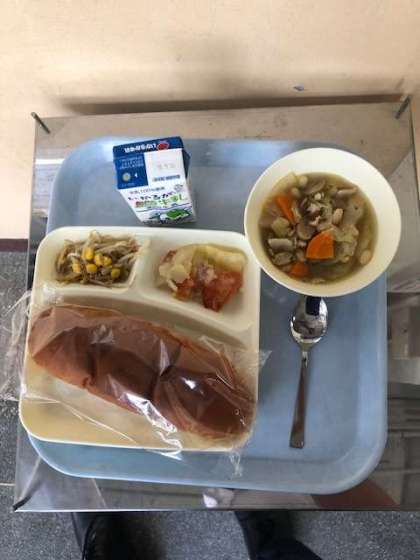 パン、牛乳 鶏肉とてぼ豆のスープ煮、じゃがいもとトマトのチーズ焼き もやしとコーンソテー