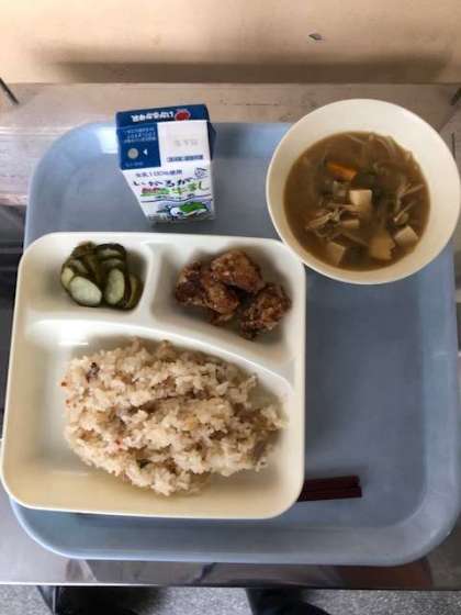 かやくごはん、牛乳 豚肉のたつたあげ、みそ汁、きゅうりの甘酢づけ
