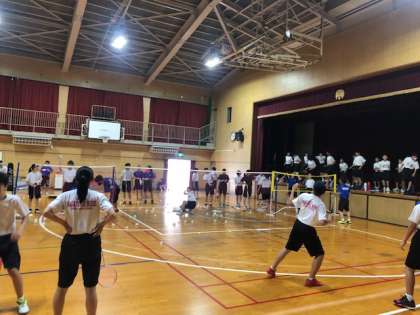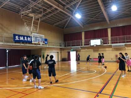 体育館では2分割で女子バスケットボール部とバドミントン部が元気よく活動しています。