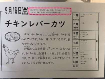 チキンレバーカツには鳥のレバーが使われています。カレー味にしているので食べやすくなっています!レバーは血液をつくる「鉄」や皮膚をじょうぶにする「ビタミンA」を含んでいます。