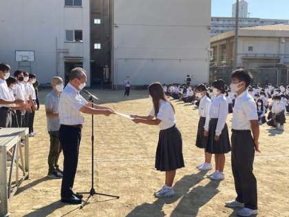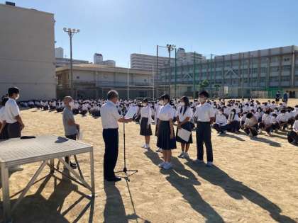 運動部の秋季大会の結果も次々と発表され、本日は水泳部とバドミントン部の表彰から全校集会が始まりました。