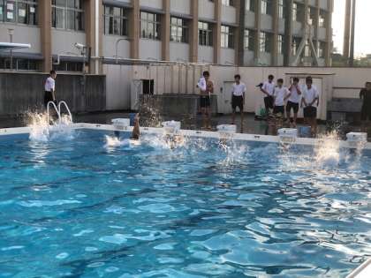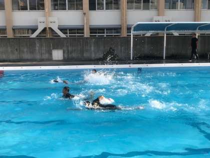 今日は着衣泳をしています。服が重くて泳ぎにくそうですね