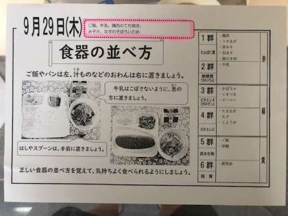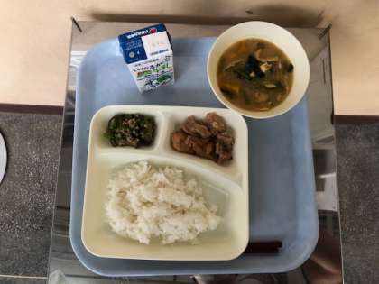 今日はごはん、牛乳、鶏肉のてり焼き、みそ汁、なすのそぼろいためでした。上手に並べられたかな?