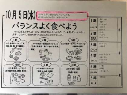 食品群は6つに分かれています。1群:タンパク質、2群:無機質(カルシウム)、3群:ビタミンA、4群:ビタミンC、5群:炭水化物、6群:脂質です。