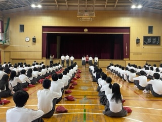 体育大会当日入退場全てにおいて三年生は素晴らしく、生徒席でも他の学年のことも応援していてそういう姿勢がすごく良かったです。いい体育大会でした。1番良かったのは学年種目の最初から終わりまで、体育委員の声がけ、それに応えるみんなの動き、感動しました。お疲れ様でした。ずっと練習してきた中でクラスの雰囲気もあったまったと思うから、それを活かして次の文化発表会で全員が一つになって全力で精一杯の力で頑張っていきましょう。