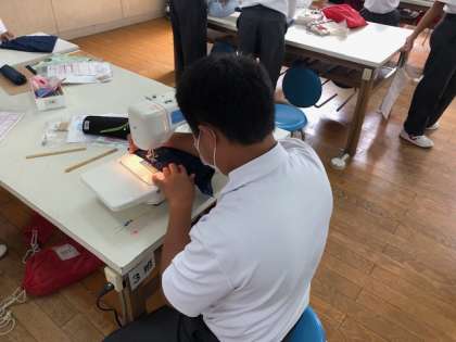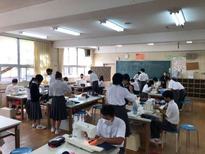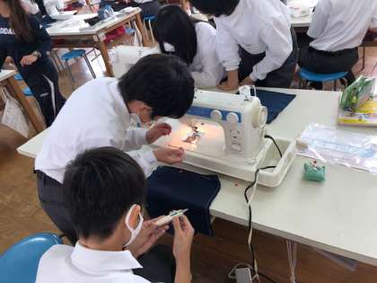 家庭科の実習では、刺し子フリークロスの制作をミシンを使ってしています。