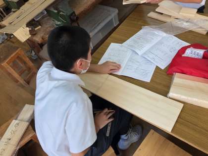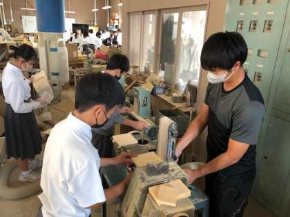 技術では先生と一緒に電動やすりで木材をきれいにしています。