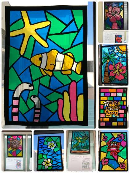 クマノミ、チンアナゴやシーサーとハイビスカスなど色鮮やかなステンドグラスで彩られています!素晴らしい作品ですね!