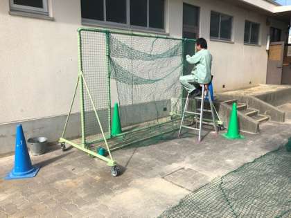 管理作業員さんにより野球部で使用するための集球ネットを整備しています。バッティングなどの練習の際にボールを集めることができるネットです。もうすぐ完成します。