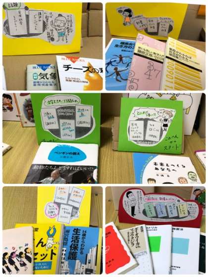 図書館の入り口には、興味をもってもらえるよう図書委員によるポップで理系や新書、文字の大きめ、とにかくうすい本など、さまざまな本が展示案内されています。