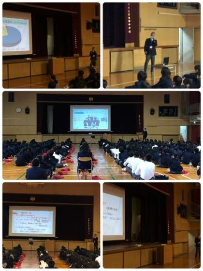 2年生は進路学習として、大阪府内の高等学校より先生を招いて講話を行いました。1つ目は私立の大阪夕陽丘学園高等学校の西村 誠先生でした。高校の部活動の紹介や高校卒業後の進路など様々なことを教えてくれました。