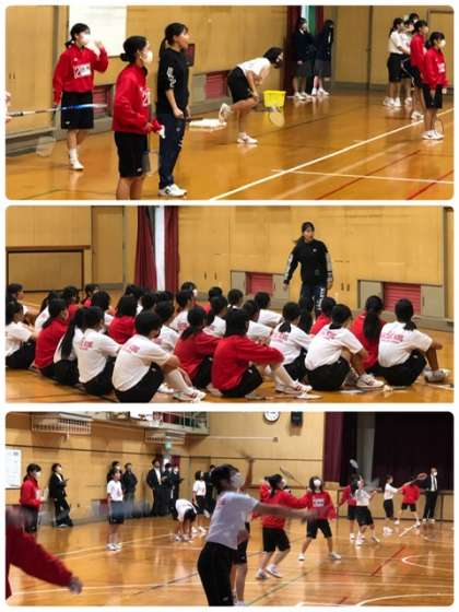 生徒の皆さんは、普段とは違う環境の中で緊張している様子でしたが、授業内容の「バドミントン」を1人1台端末を利用しながらフォームを確認したり、振り返ったりしました。適応力の高い彼女たちは、後半にはリラックスして取り組めているようすでした。