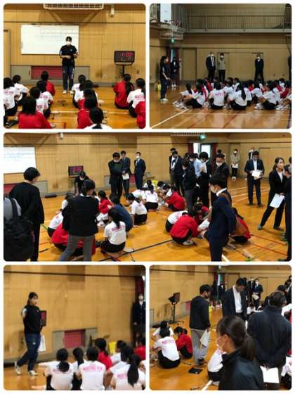 6限目の時間は2年2・3組の女子が対象となる研究授業を本校体育館で実施しました。大阪市内の多くの先生方が来校して、授業のようすを見学し、勉強しました。
