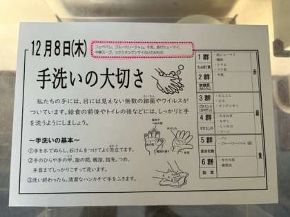 私たちの手には、目には見えない無数の細菌やウイルスがついています。給食の前後やトイレの後などには、しっかりと手を洗うようにしましょう。