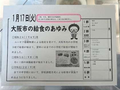 ユニセフ寄贈物資による指定を受けて、大阪市内の小学校3校で給食が始まり、翌年には全ての小学校で給食が開始されました。