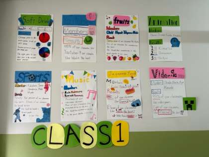 英語の授業で「クラスの人気調べ」を行い、結果を各クラスの人気投票をジャンルごとに行い廊下に掲示しました。みんなの好きなものは何でしょう?廊下で見てみてください!!
