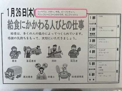 西中では、4時間目の時間に配膳員さんが教室まで給食を運んでくれますよね。しかし、もとを辿っていくと作った給食を運んでくる運送業者さん、作ってくれる調理員さん、野菜やお肉を納品してくれる農家さんなど、みんなの口に入るまでの多くの方の支えで存在しますね。