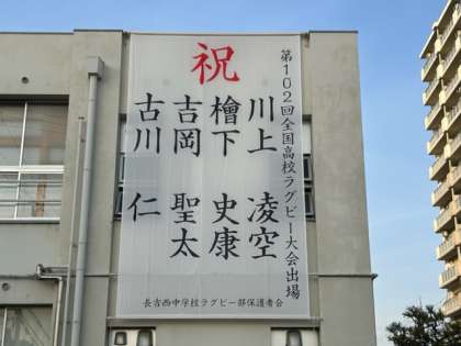 さて、本校校舎正面に、長吉西中学校ラグビー部保護者会より、第102回全国高校ラグビー大会出場として卒業生の名前が掲示されています!「西中から全国へ、世界へ」卒業生は頑張っています!今後とも、応援宜しくお願いします!