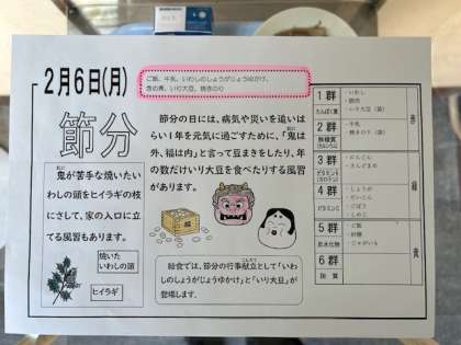 節分の日には、病気や災いを追いはらい1年を元気に過ごすために、「鬼は外、福は内」っと言って豆まきをしたり、年の数だけいり大豆を食べたりする風習があります。