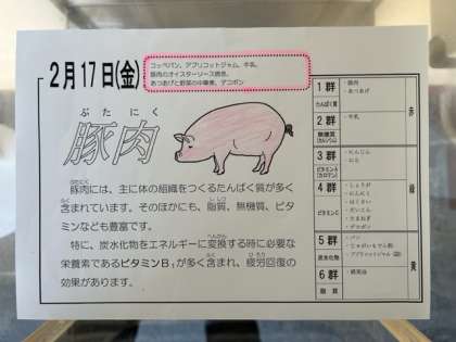 豚肉には、主に体の組織をつくるたんぱく質が多く含まれています。そのほかにも、脂質、無機質、ビタミンなども豊富です。
