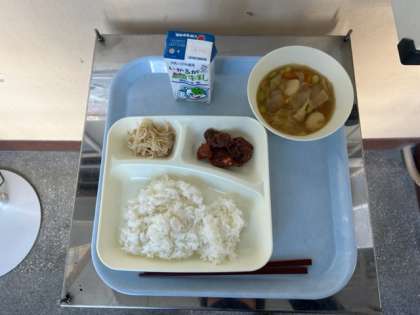 今日の給食の「くじらのオーロラ煮」は、油であげたくじらに、ケチャップや赤みそなどで作ったたれをからませています。