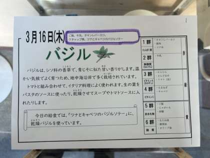 今日の給食では、「ツナとキャベツのバジルソテー」に、乾燥バジルを使っています。