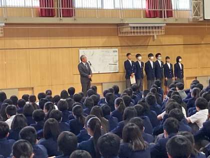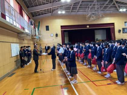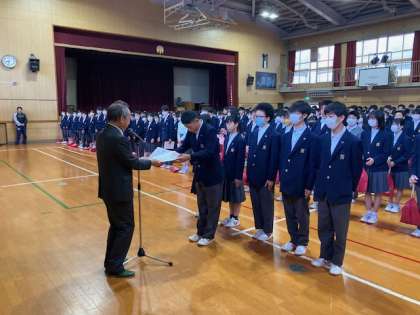 はじめに、本日より始まる各種委員会の認証式が行われ、ソフトテニス部や卓球部が活躍した表彰もありました。