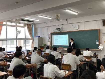 2年生では、教育実習の先生たちそれぞれから、中学から高校、大学に至るまでの進路の考え方や、学校の先生を目指すに至るまでのお話を聞くことができました。