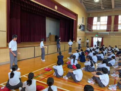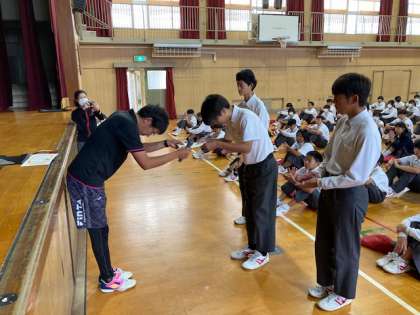 2年生の学年集会では、体育大会での学年種目「台風の目」の表彰が行われました。