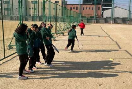 ソフトテニス部は新しく緑色の部活パーカーを着ての練習で、1年生はとても楽しそうです。
