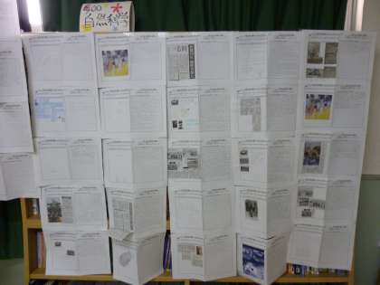 夏休みに生徒が平和に関する事を調べレポートを作成しました。本年度は「800人の語り部」という聞き取り活動も行いました。