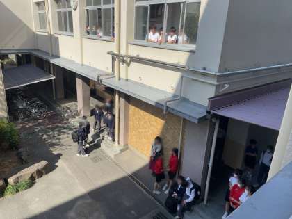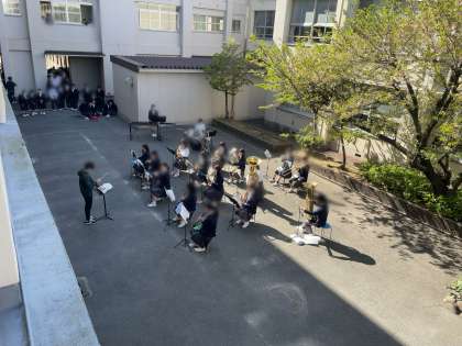 本日放課後に中庭で吹奏楽部によるスプリングコンサートが開催されました。演奏を一目見ようと、中庭、校舎にはたくさんの生徒の皆さんや教職員が駆け付けました。1曲目は「天体観測」、そして「フライングゲット」と続きました。そしてギャラリーの「アンコール♪アンコール♪」の声援に応えるように、最後は「September」で締めくくりました。この日のために、たくさん練習を重ねてくれたことと思います。吹奏楽部の皆さんありがとうございました。
