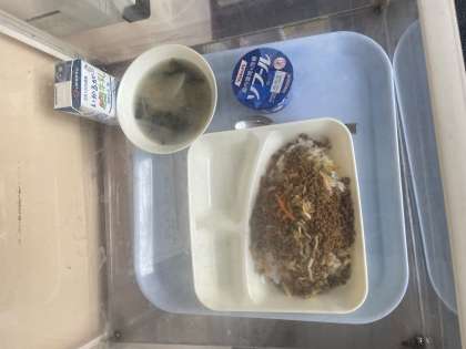 本日の給食は「ビビンバ(肉)、ビビンバ(野菜)、トック、ヨーグルト」です。