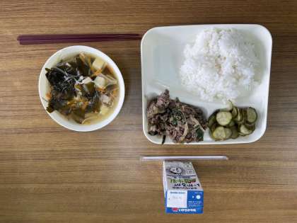 とうふとわかめのスープ、きゅうりの甘酢づけ