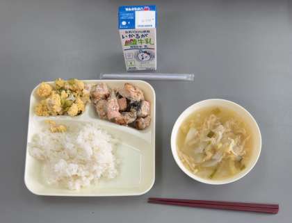 さけのごまみそ焼き、五目汁、えんどうの卵とじ