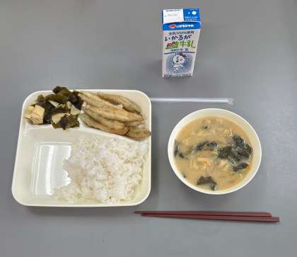 ご飯、牛乳、きびなご天ぷら、みそ汁、わかたけ煮です!