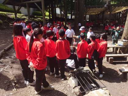 かまど係の生徒が曽爾少年自然の家のスタッフの方から、かまどの火の管理がうまくいくよう、まきの使い方などのレクチャーを受けています。