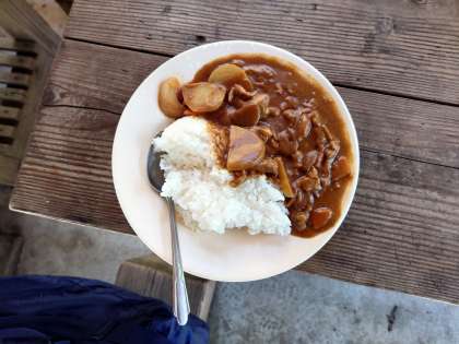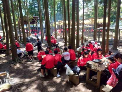 まだ調理中の班もありますが、ほとんどの班が無事にカレーづくりを終え、班のメンバーでカレーライスを食べています。