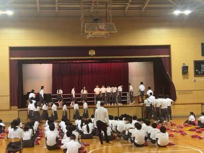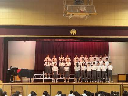 舞台への上がり方や作法などの確認を行います。また実際に体育館で伴奏に合わせて歌いました。緊張もあった様子でしたが、見つかった課題を生かして本番へつなげてください。
