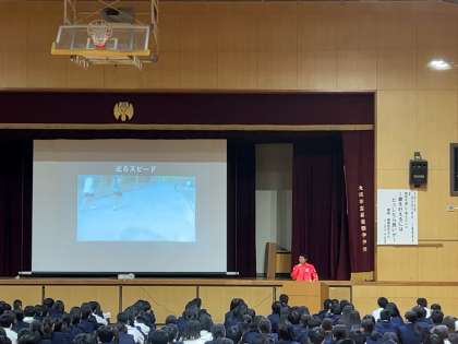 本日はNTT西日本陸上競技部の堀越信司様に来校いただき、お話をしていただいてます!『競技を通して学んだこと。〜夢を叶えるにはどうしたら良いか〜』というテーマで写真なども使いながら心に響くお話です。是非学んだことを今後の生活に活かしてください。