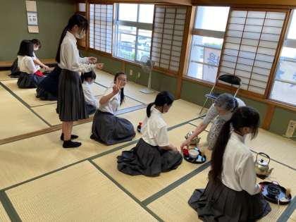 茶道部は作法の流れを先輩部員が1年生に丁寧に教えています。