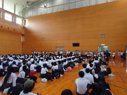 3年生を乗せたバスは、民泊体験入村式会場である鯖江市スポーツ交流館に到着しました。